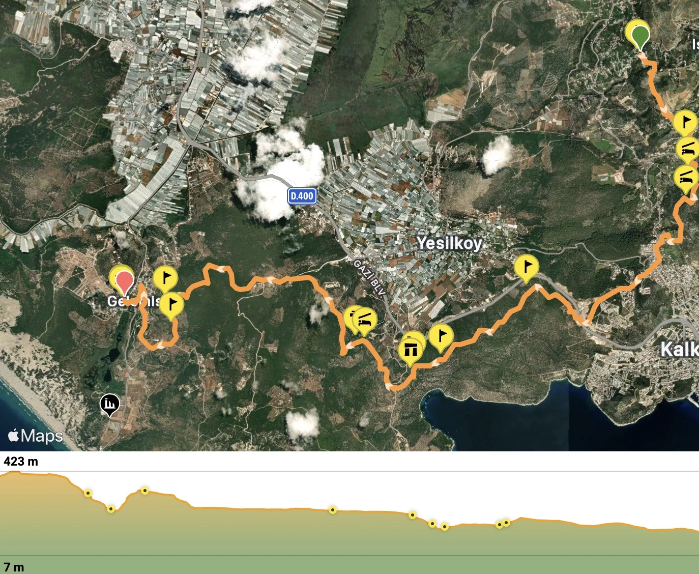 This section of the Lycian Way offers a characterful, moderately challenging walk that combines natural scenery with a sense of history. The route begins with generally flatter, gently descending sections, before a more pronounced climbstarts after Hacıoğlan Stream, leading to a steep ascent over the final 3–4 kmup to Phellos.