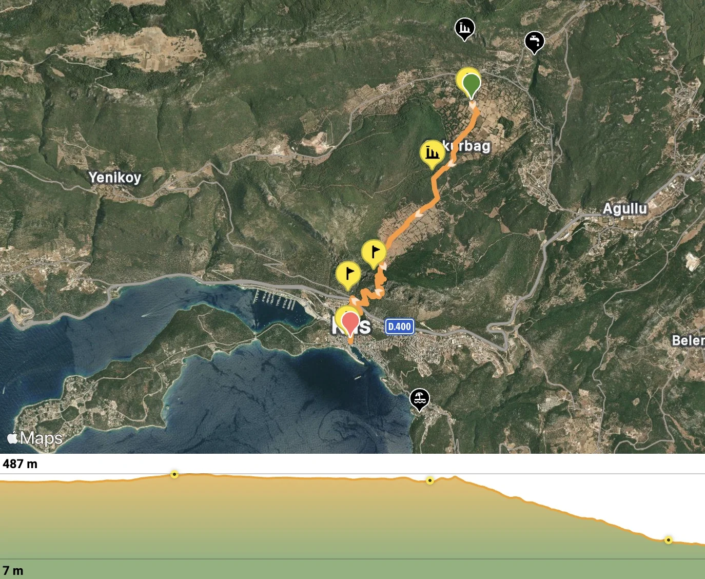 This route starts at around 900 meters above sea level and gradually descends to sea level. The trail winds through cool pine forest paths, with sections of ancientstone-paved tracks and short stretches of gravel roads. As you approach Kaş, wide views of the sea and nearby islands open up, and the walk finishes with abroad panoramic outlook over the town.